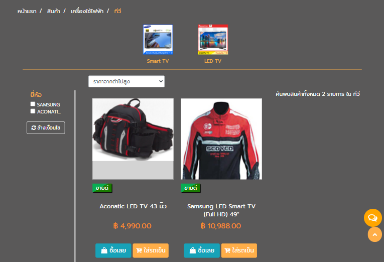 แสดงแยกตามประเภทสินค้า สามารถค้นหาตามยี่ห้อ หรือ คำค้น "Keyword" และกรองตามราคาสูงไปต่ำได้ หรือต่ำไปสูงได้