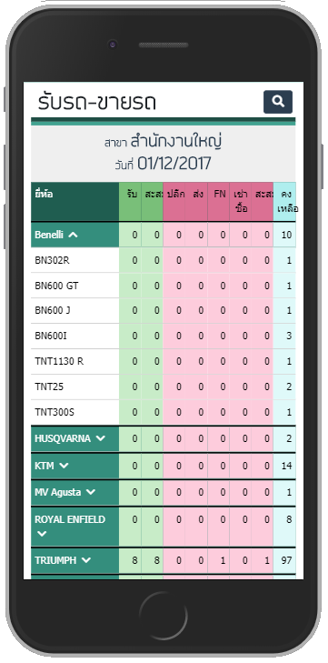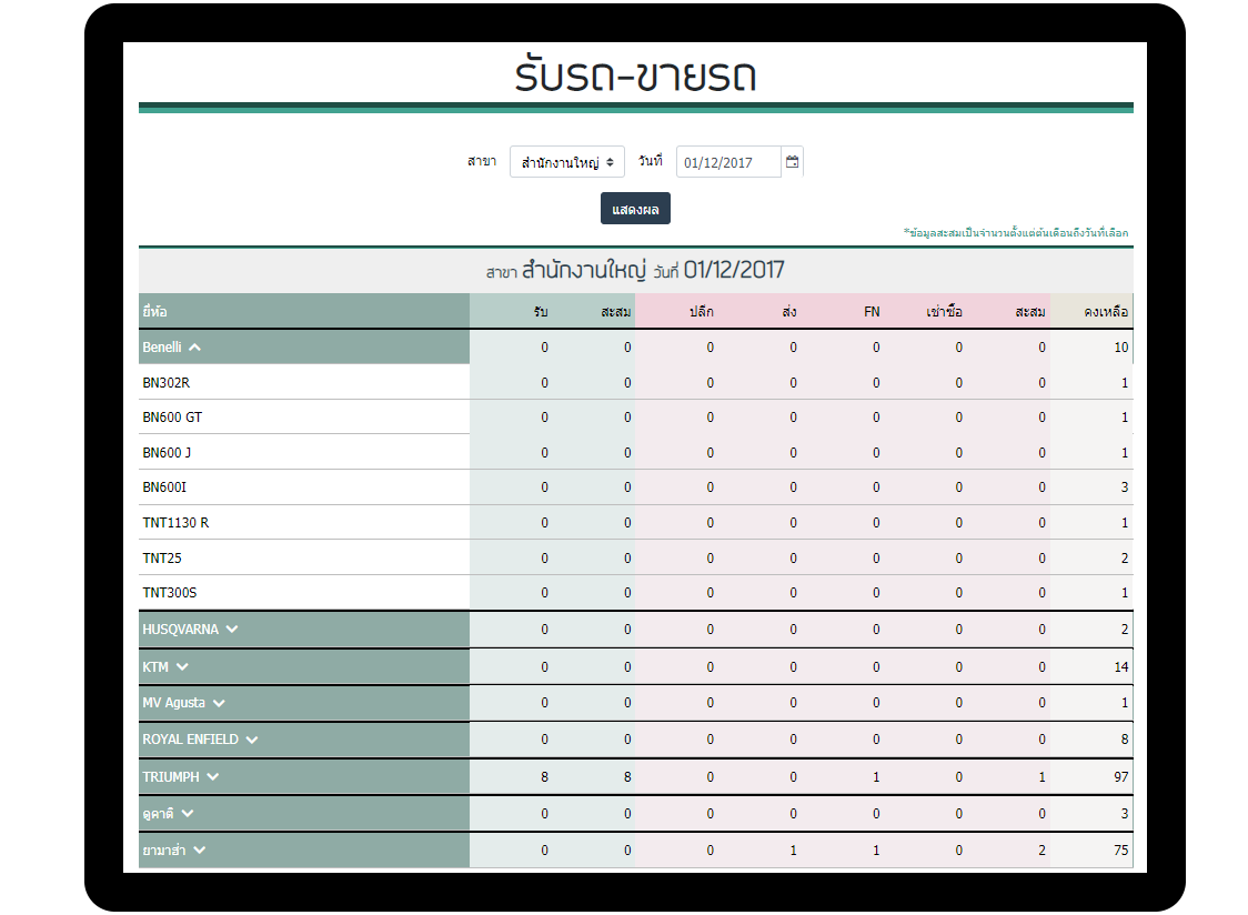 แสดงจำนวนสินค้าที่ รับรถ ขายรถแบบปลีก ขายรถแบบส่ง เช่าซื้อ ไฟแนนซ์ จำนวนคงเหลือ แยกตามยี่ห้อ รุ่น โดยจะแสดงตามเงื่อนไขที่เลือก