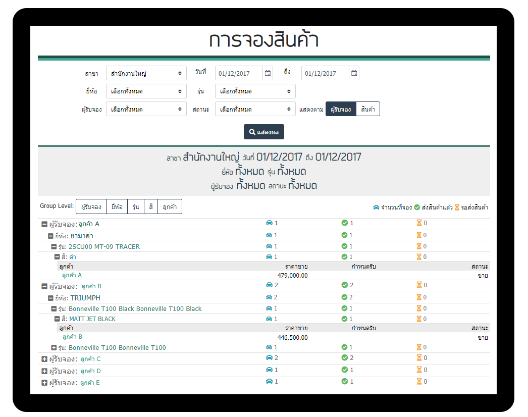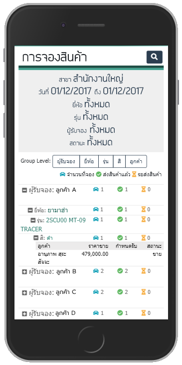 แสดงผู้รับจอง ยี่ห้อ รุ่น ของสินค้า รวมถึงลูกค้า โดยจะแสดงตามเงื่อนไขที่เลือก
